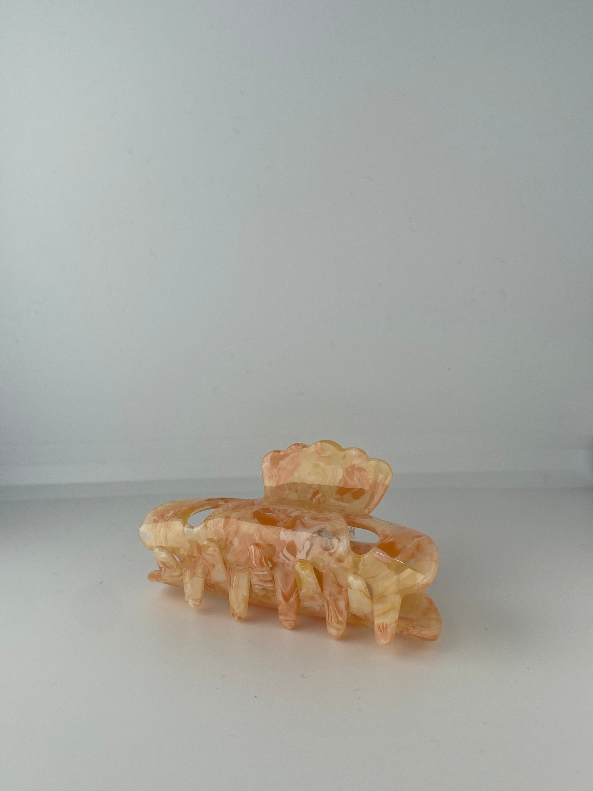Die Haarklammer RIEKE ist mehrfarbig und hat eine glänzende Oberfläche. Die Haarklammer hat die Farben orange, gelb und weiß. Sie passt sich perfekt jeder Haardicke an.