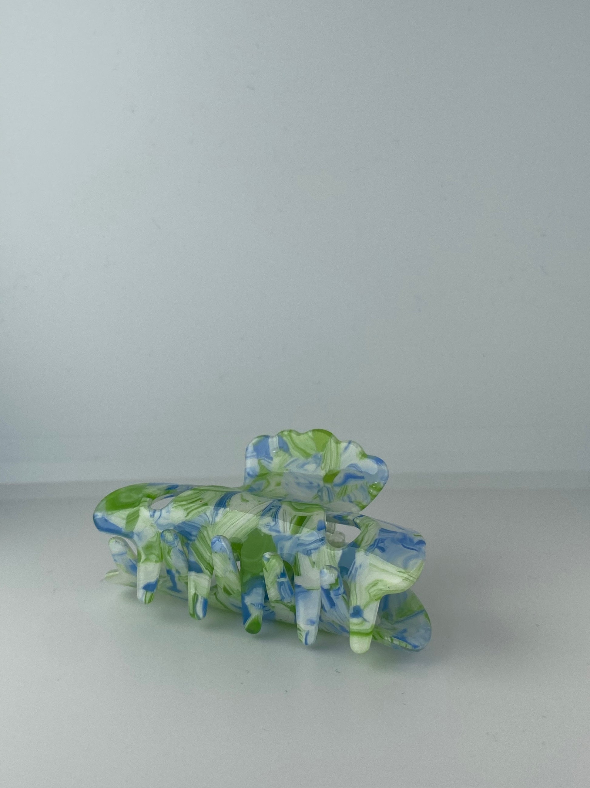 Die Haarklammer REBECCA ist mehrfarbig und hat eine glänzende Oberfläche. Die Haarklammer hat die Farben grün, blau und weiß. Sie passt sich perfekt jeder Haardicke an.
