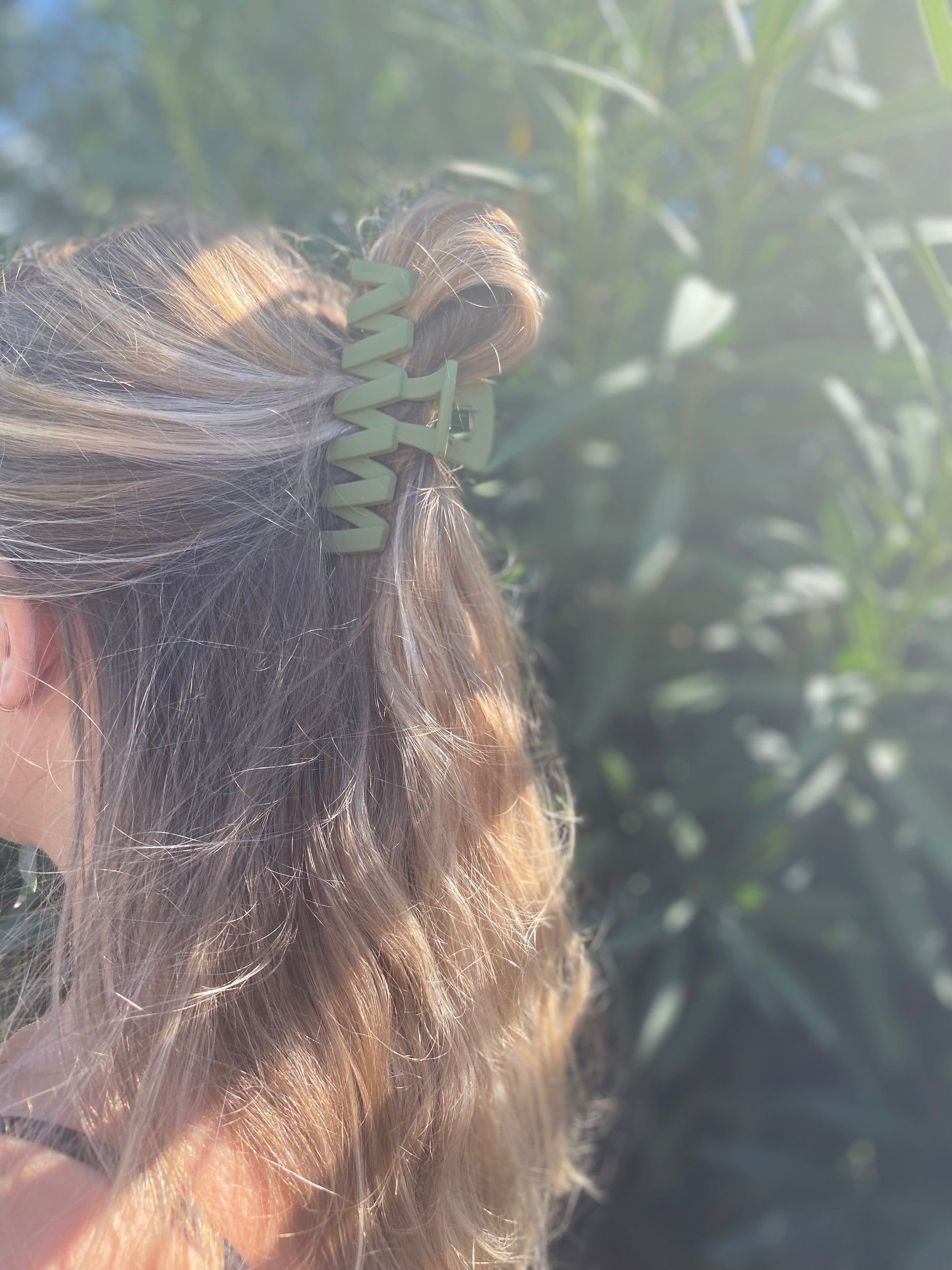 Die Haarklammer SISSY - hat einen auffälligen Khaki/Grünton und hat eine matte Oberfläche. Das Besondere an dieser Haarklammer ist ihre Zick-Zack Form. Mit diesem Accessoire wird aus jeder Frisur ein wahrer Hingucker.
